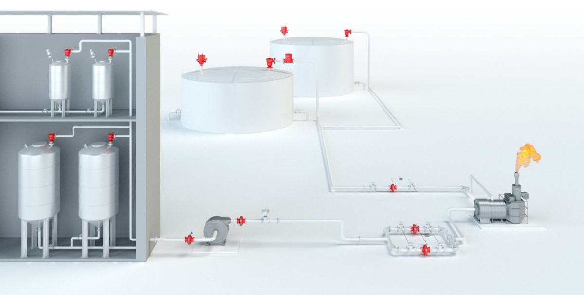 - Tank farms for flammable liquids with pressure and vacuum relief diaphragm valve UB/SF, connection to gas vent header system with detonation flame arrester DR/ES-V or DR/ES and pressure or vacuum relief valve DZ/T.