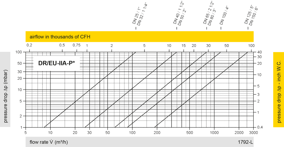 The flow capacity charts have been determined with a calibrated and TÜV certified flow capacity test rig. Volume flow V in (m³/h) and CFH refer to the standard reference conditions of air ISO 6358 (20°C, 1bar). For conversion to other densities and temperatures refer to Sec. 1: “Technical Fundamentals”.