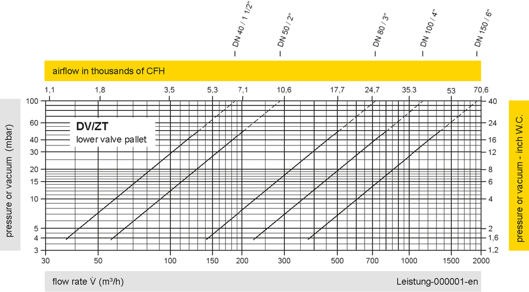 The flow capacity charts have been determined with a calibrated and TÜV certified flow capacity test rig. Volume flow V in (m³/h) and CFH refer to the standard reference conditions of air ISO 6358 (20°C, 1bar). For conversion to other densities and temperatures refer to Sec. 1: “Technical Fundamentals”.