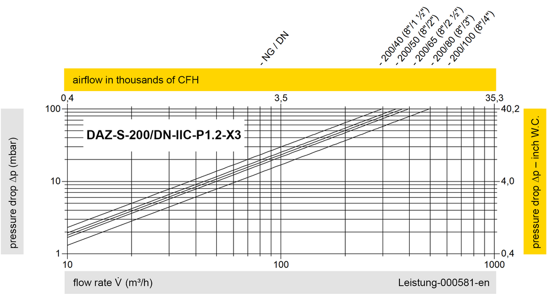 The flow capacity charts have been determined with a calibrated and TÜV certified flow capacity test rig. Volume flow V in (m³/h) and CFH refer to the standard reference conditions of air ISO 6358 (20°C, 1bar). For conversion to other densities and temperatures refer to Sec. 1: “Technical Fundamentals”.